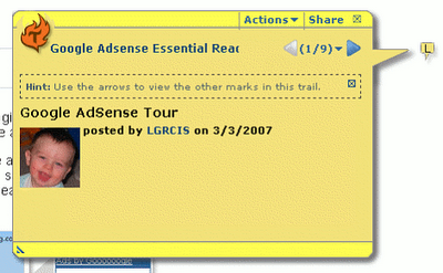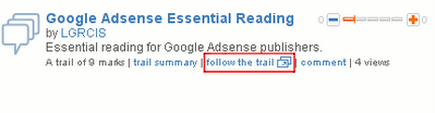 Once you create a web trail you can make it publicly available on the Trailfire website on your profile page. For an example you can view my profile page and see that I have created one trail titled “Google Adsense Essential Reading”. To follow the trail of web sites I added to the “Google Adsense Essential Reading” trail simply click the “follow the trail” link and you can go through the sites I added one by one. When you are on the trail you will see a little icon on the page (