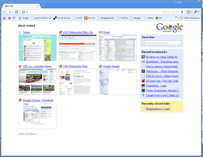 Google Chrome web browser has been released to the world now and I just could not help but download it and install it to see how it looks and works. My first impressions are that it installed quickly and runs fast.