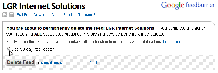 Once you have your email subscribers exported and saved on your computer you can click the link near the top titled “Delete Feed”. Once you click that link a box will open up offering you the opportunity to redirect your feed for 30 days. Make sure you select the 30 day redirection. It will help you to not lose RSS subscribers.